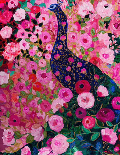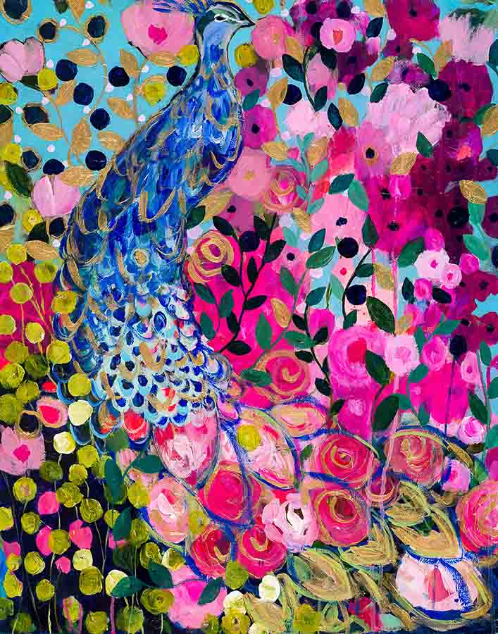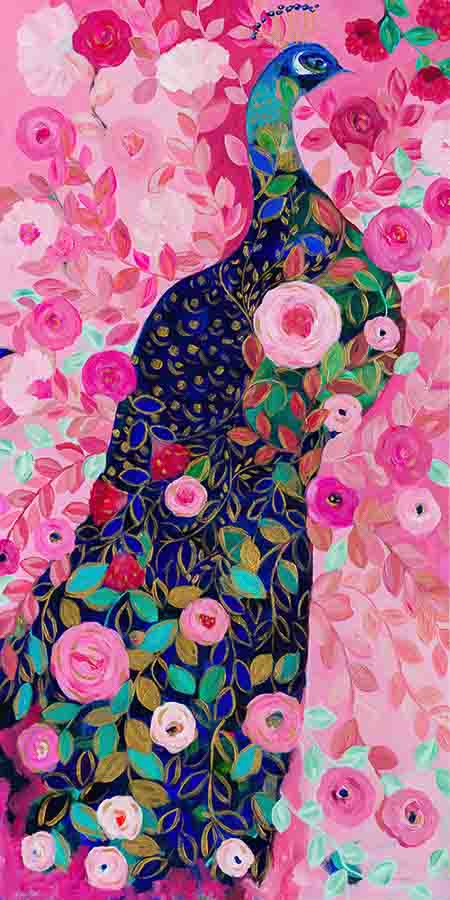 I returned home to work on this floral painting, and suddenly a peacock appeared. Our peacock baby was born!