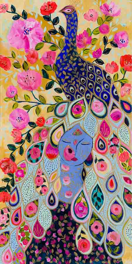 This peacock appeared on this flowery canvas after I visited my neighbor’s farm. A male peacock tried to impress the peahen next to me.